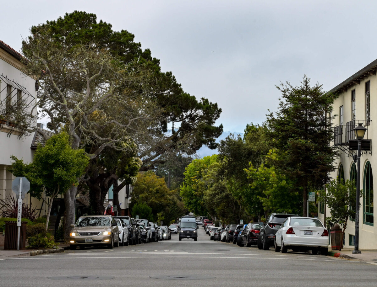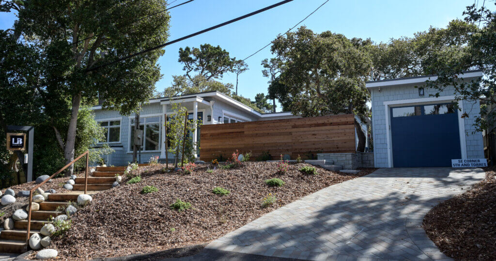 In the photo below, a very rare brand new (or possibly extensively remodeled) house in Carmel-by-the-Sea. I would argue that, absent the questionable choice of siding color, it otherwise fits very well into its surroundings and is what one would expect to see in Carmel. It is tucked under the existing tree canopy, sits rather regally on its hilly lot, and has plenty of square footage hidden behind its rather modest street frontage.