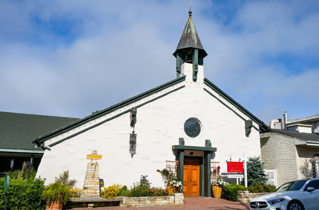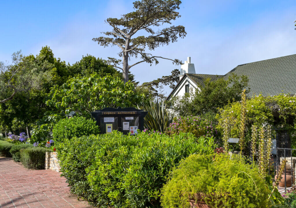 In 1905 the first Protestant church in Carmel was built on the site where The Church of the Wayfarer now stands. Due to structural deficiencies, that building was completely redesigned and reconstructed in 1940, resulting in the simple but beautiful (and interestingly, asymmetrical) church which stands on the site today. According to the Carmel Heritage Society website (which has many pictures of the interior of the church), it features 18th century walnut wainscotting (1940) and leaded glass windows (1982). I’ve always admired this church because of the beautiful gardens which surround it, which feature plants specifically mentioned in the bible. Another interesting note: the website for the church invites attendees to bring their dogs to services with them. Its Carmel, after all!
